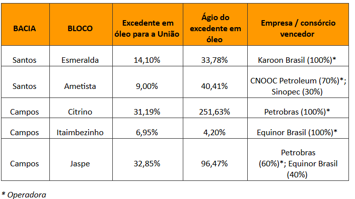 Todos os blocos arrematados tiveram ofertas de excedente em óleo para a União maiores do que o mínimo do edital. O ágio médio do excedente em óleo foi de 91,20%. O maior ágio foi de 251,63%, no bloco de Citrino.