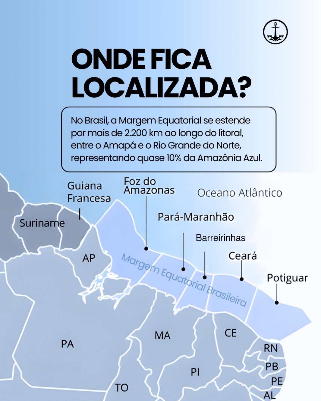 Mapa destaca a extensão da Margem Equatorial brasileira, que abrange cinco bacias sedimentares e se projeta como nova fronteira energética do País — Imagem: Marinha do Brasil