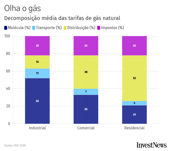 Um estudo da Fundação Getúlio Vargas (FGV) voltado ao segmento industrial, setor que é responsável pelos maiores volumes de consumo, mostra que a molécula do gás responde por até 53% do preço final, enquanto o serviço de distribuição representa entre 14% e 16% e o transporte cerca de 11%. Nos segmentos comercial e residencial, o transporte é ainda menos relevante, com peso médio próximo de 5%.
