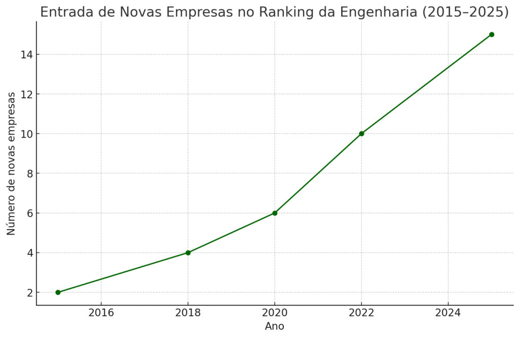 A cada edição do ranking, novas empresas passaram a figurar entre as 500 maiores. Esse movimento demonstra que a engenharia brasileira está longe de ser estática: novas companhias surgem e se consolidam em ritmo acelerado.