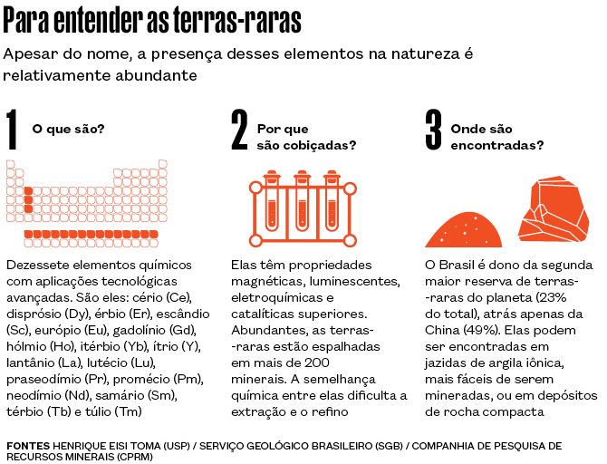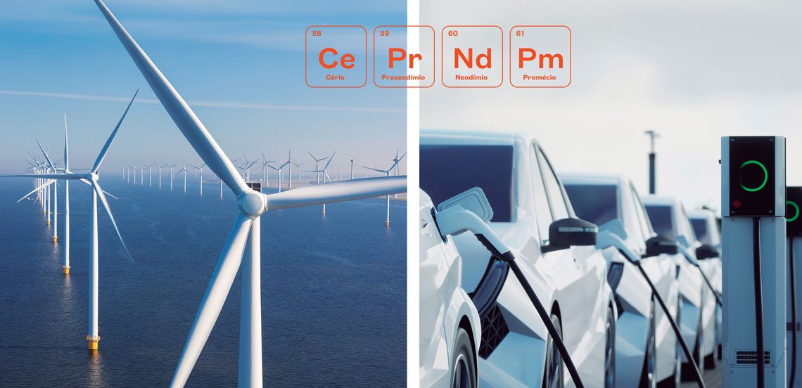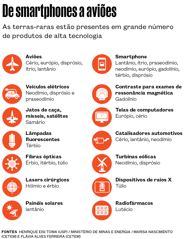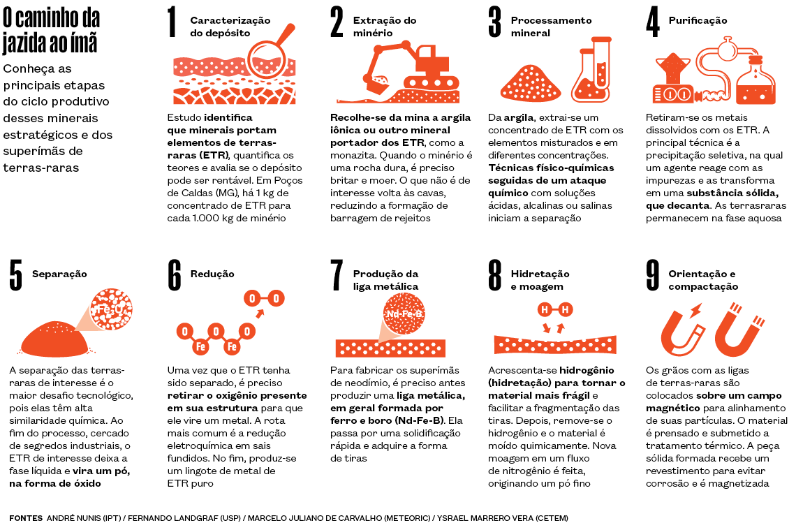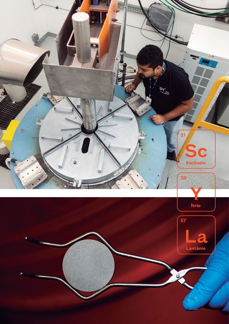 m prédio de três andares com fachada envidraçada localizado em Lagoa Santa, município a 35 quilômetros de Belo Horizonte, sedia uma estrutura fabril e laboratorial que poderá ajudar o Brasil a dominar o ciclo completo de produção de ímãs permanentes de terras-raras. Também chamados de superímãs, em razão de sua elevada força magnética e resistência à desmagnetização, esses componentes são usados em aplicações relacionadas à defesa, energia limpa e mobilidade elétrica, com destaque para motores de carros elétricos e de turbinas eólicas. O principal elemento químico empregado em sua fabricação, o neodímio (Nd), é uma das 17 terras-raras da tabela periódica, consideradas fundamentais para a transição energética. Por causa de suas propriedades especiais, como magnetismo intenso, luminescência e condutividade, esse grupo de elementos químicos é largamente usado em produtos e processos de alta tecnologia. Além dos superímãs, são empregados na fabricação de catalisadores usados pela indústria de óleo e gás, fibras ópticas, telas de computadores, celulares, jatos militares, mísseis e marcadores luminescentes para análises biomédicas (ver infográfico). Nos últimos tempos, as terras-raras têm estado no centro de uma disputa geopolítica mundial.