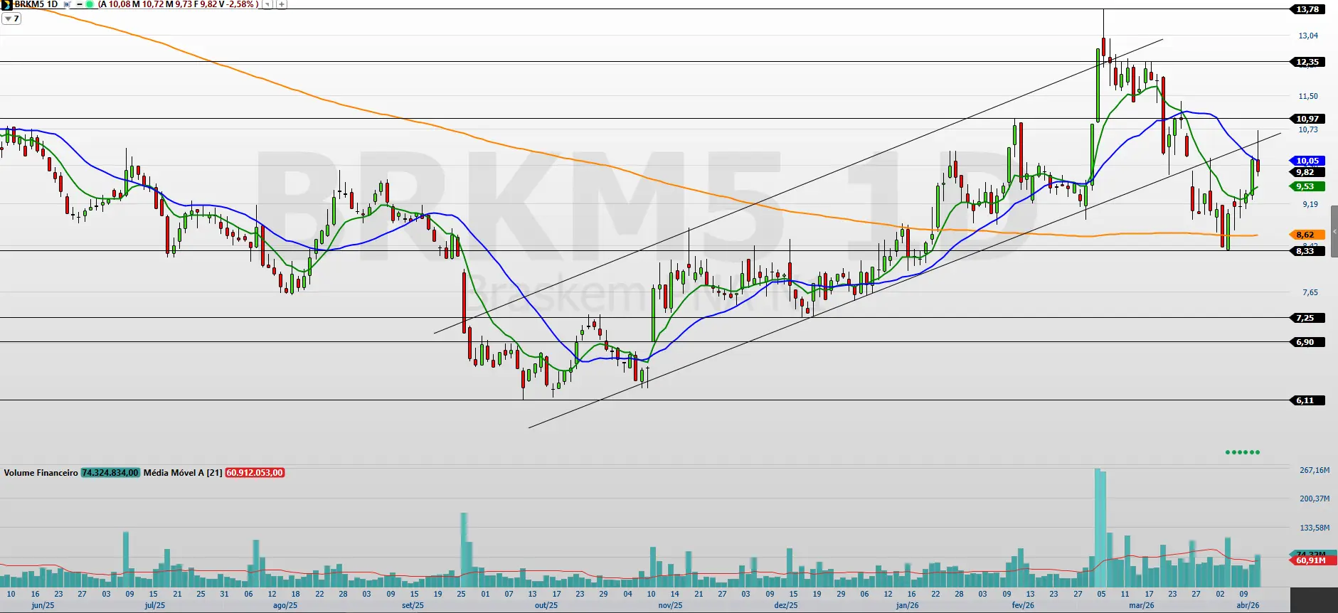 As ações da Braskem (BRKM5) entram em um momento técnico mais delicado após a perda da linha de tendência de alta (LTA), que sustentava o movimento recente. Depois de testar a resistência em R$ 13,78, o ativo passou por uma correção mais intensa e voltou a negociar próximo de R$ 9,82, com sinais claros de rejeição compradora na última sessão, indicando presença mais ativa dos vendedores.