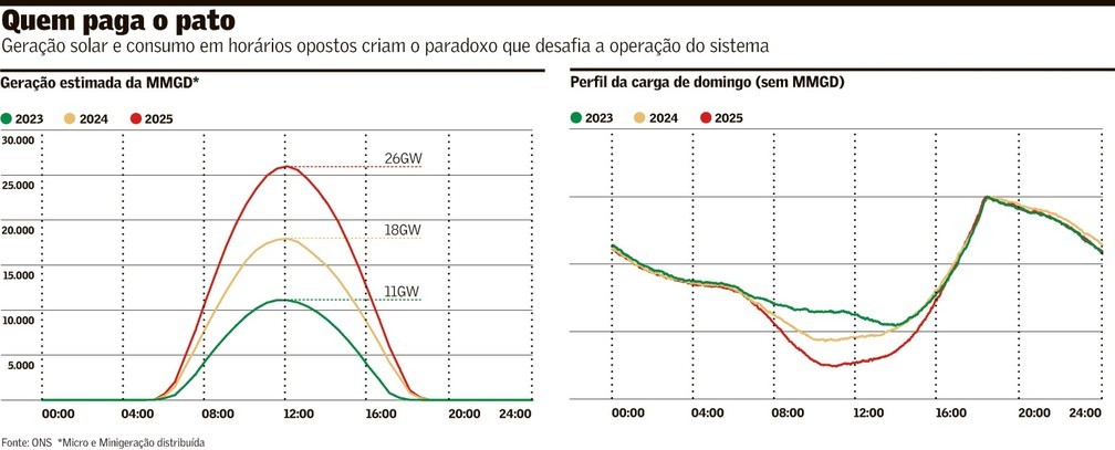 No fim da tarde, essa produção de energia desaparece com o pôr do sol, obrigando o país a se apoiar em fontes mais caras. A preocupação com um blecaute provocado por excesso de energia solar é tão grande que a Agência Nacional de Energia Elétrica (Aneel) convocou reunião extraordinária com distribuidoras e ONS para debater soluções.