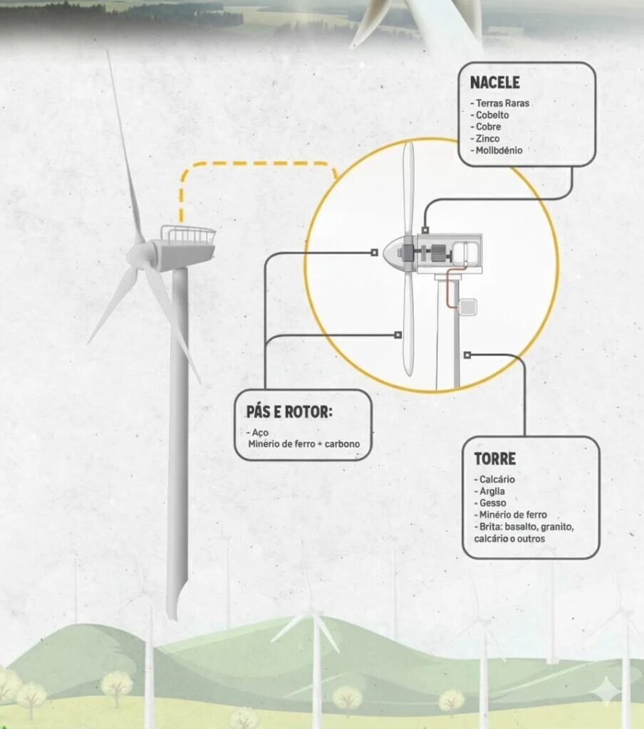 As torres de concreto, que sustentam toda a estrutura, são compostas por cimento, calcário, argila e gesso, podendo incluir até 60% de outros minerais, como ferro e brita – formada por rochas como basalto, granito e calcário. A base garante que os aerogeradores resistam aos ventos fortes e intempéries por décadas. Outros minerais também estão presentes nos aerogeradores, como cobalto (em baterias), cobre e zinco (nas fiações) e molibdênio (em ligas especiais de alta resistência).