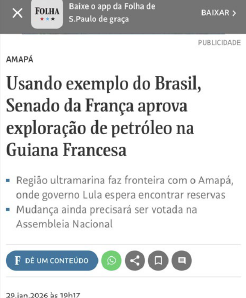 Na Guiana Francesa, um território ultramarino que tradicionalmente tinha restrições legais à atividade petrolífera, o Senado francês aprovou em 29 de janeiro de 2026 uma proposta para permitir a exploração de petróleo e gás, abrindo caminho para que o desenvolvimento de recursos energéticos também seja uma realidade desse lado da fronteira. Esta era o único território que estava impedindo a atividade petrolífero. Desde 2017 estava proibido a atividade na região. Portanto, a Guiana Francesa agora também faz parte da “Rota do Petróleo”.