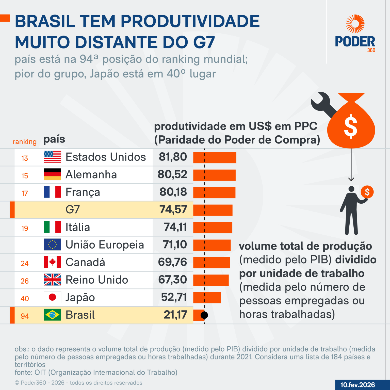O cálculo de produtividade feito pela OIT é assim: o PIB (Produto Interno Bruto) é dividido pelo total de horas efetivamente trabalhadas. No infográfico abaixo, os valores estão convertidos em dólares por paridade do poder de compra para permitir a comparação internacional: