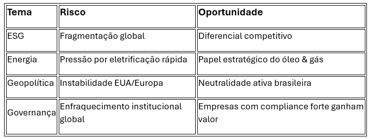 Para o Brasil, país exportador de energia, alimentos e minerais críticos, esse cenário gera riscos relevantes, mas também janelas estratégicas, especialmente no debate sobre ESG, transição energética e o setor de petróleo & gás.